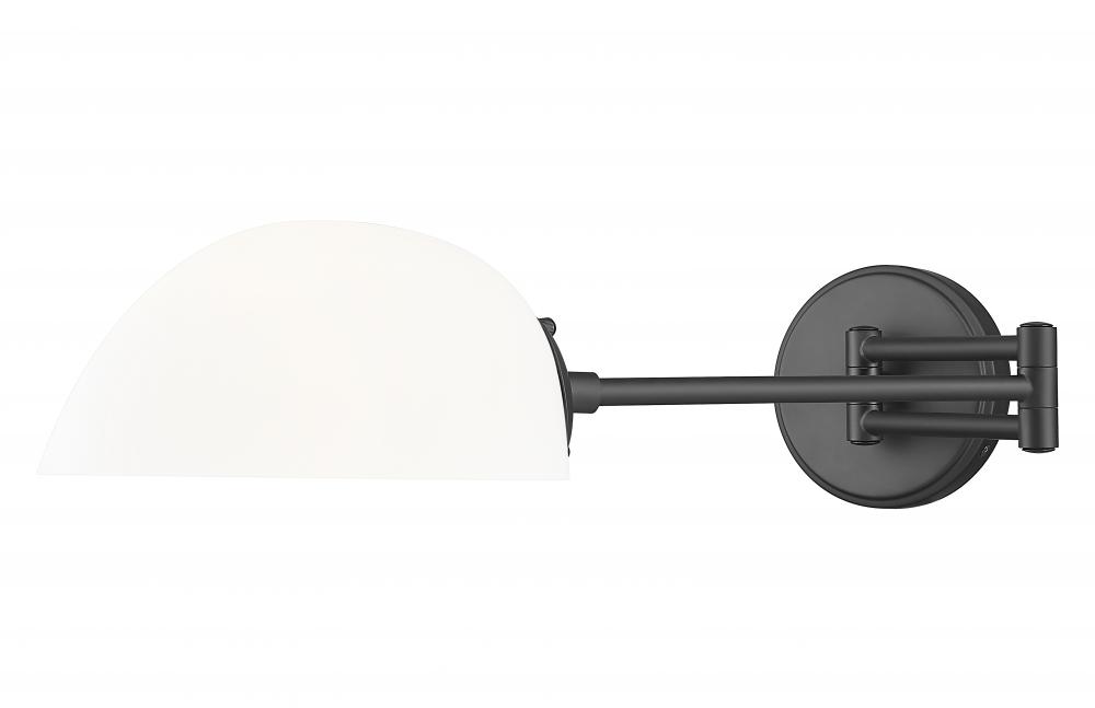 Bold contrasting tones are striking and stylish as this one-light wall sconce offers function and fashion in one design. Matte black finish steel forms a structured frame with adjustability to direct lighting from side to side, as well as upward and downward by repositioning its shapely opal white glass hood shade. A superb choice for living rooms and home offices, this dimmable fixture fulfills a host of lighting objectives.