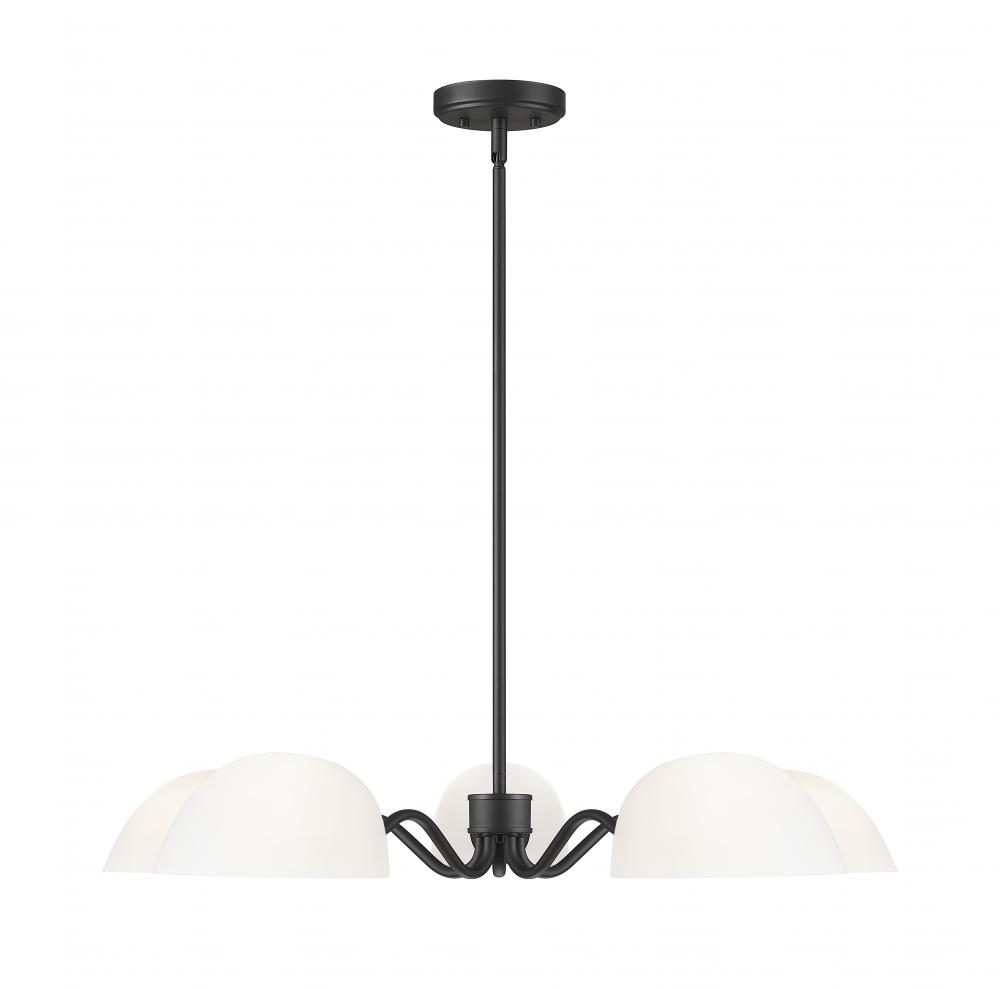 Choose stylish flexibility and versatility with this modern five-light chandelier. It pairs elegantly domed opal glass shades with curvy arms and a matte black frame finish, delivering impressive depth and character over living, dining and bedroom spaces. The shades rotate to cast up or down lighting to suit your preference and space.