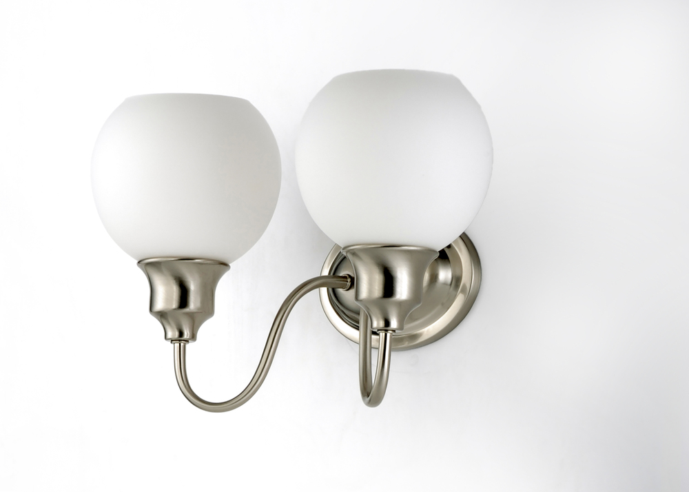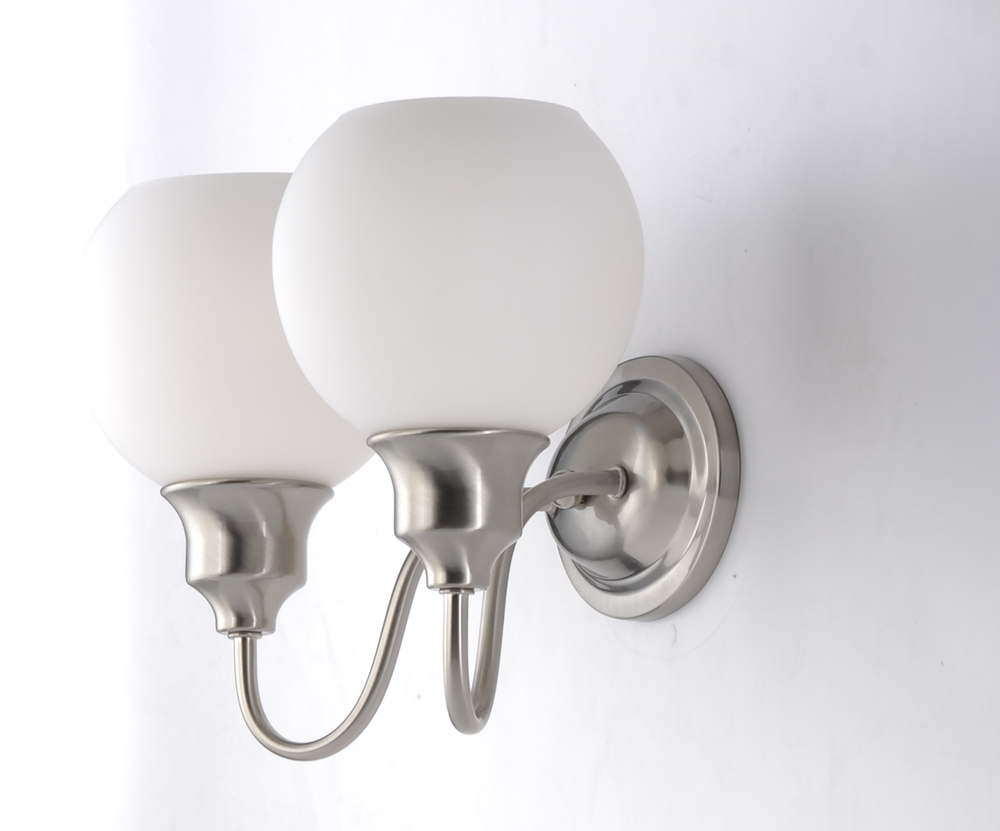Curved arms support circular glass with an open bottom which can be installed facing up or down. Available in your choice of Polished Chrome with Clear glass or Satin Nickel with Satin White glass.