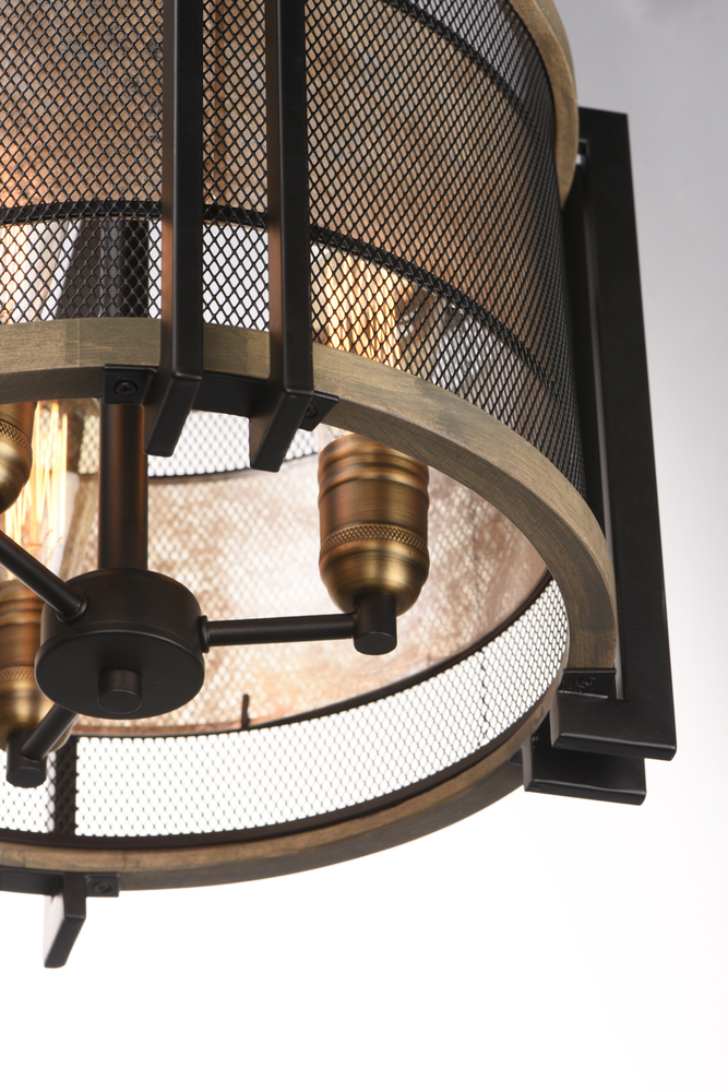 Frames of wood finished in Barn Wood and cradled by Black metal brackets were used to create this beautiful rustic design. The Black mesh screen is accented with a band of mica and Antique Brass sockets to deliver rustic charm with all the right fixings.