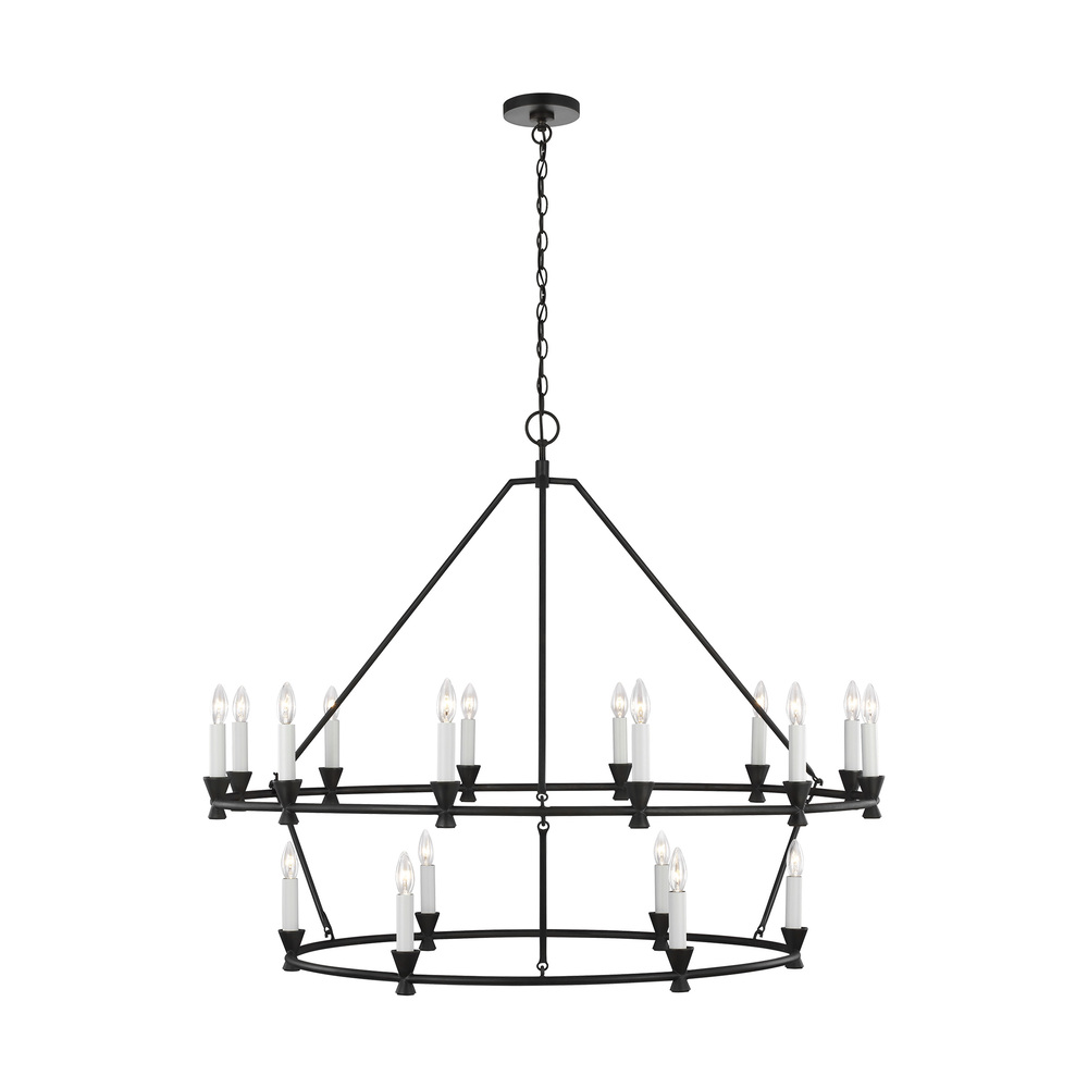 The Keystone eighteen light multi-tier chandelier highlights the popular wagon wheel silhouette. Perfect for a large foyer or dining room, the exposed candelabra on an angular, Aged Iron frame ensures the Keystone family casts a warm and inviting glow. This series of chandeliers, sconces and pendants designed by Chapman & Myers for Visual Comfort Studio features very detailed construction including bobeches supporting each candle tube. The candle cups were based on a totem shape candle created by Alberto Giacometti and the frame is a re-interpretation of a one of Diego Giacometti’s hanging sculptures.