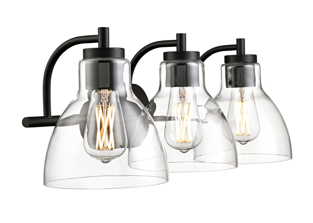 Refined simplicity is the hallmark of the Knightsdale Family of vanity lighting. Graceful bell-shaped clear glass shades set an elegant tone and provide a crisp clear lighting effect perfect for any bath. The minimalistic hardware strikes the perfect balance with the shades and is finished in matte black, chrome, or modern gold. Available as 1, 2 and 3-light options, these fixtures create a sleek and understated profile.