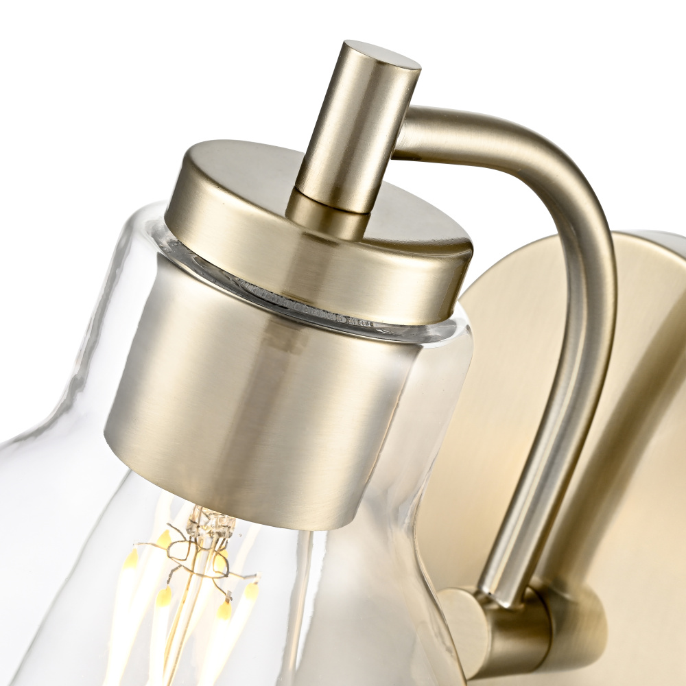 This fixture features a modern gold finish and clear glass shade.
