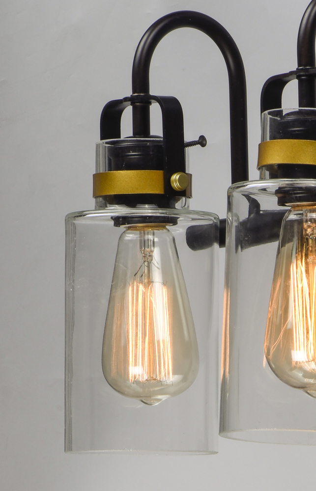 Modern farmhouse design requires vintage looks with an updated style. This collection fits this definition with minimalistic styled frames of Bronze with Gold accents that cradle Clear mason jar shaped glass. Add vintage bulbs for farmhouse appeal or tubul