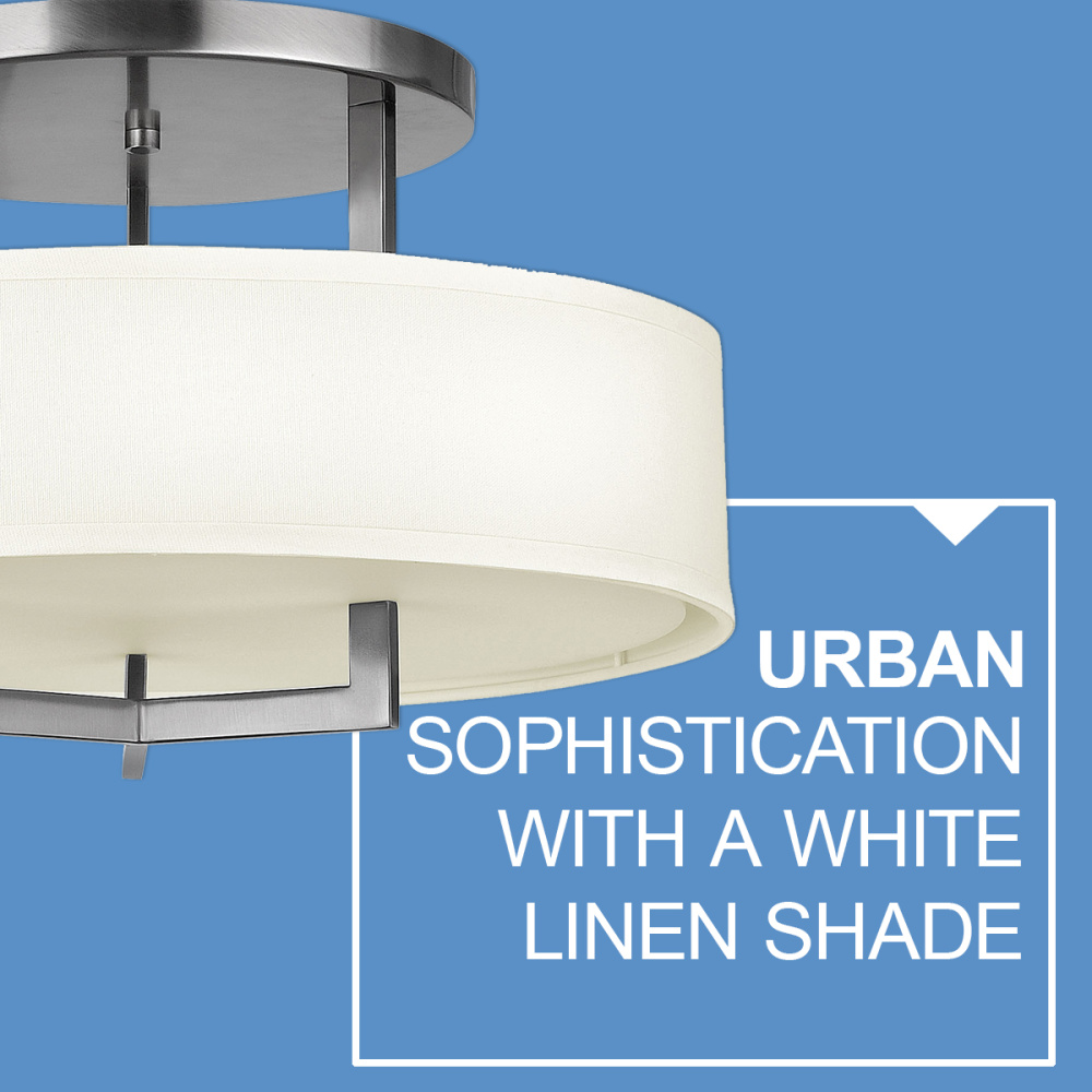 Hampton is a modern transitional design, offering the ultimate in urban sophistication. The minimal, rectangular frame is softened by a contemporary off-white linen drum shade.