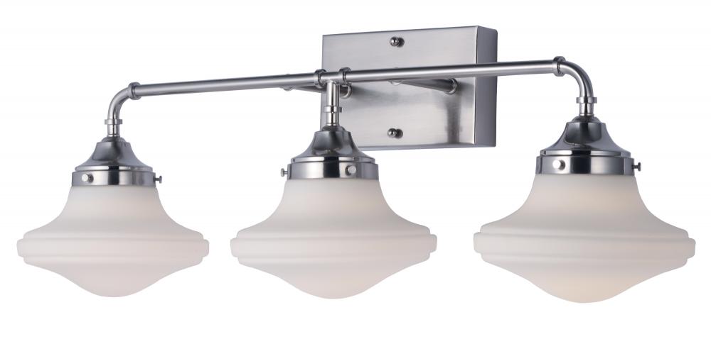 This classic look was updated with modern day styling and technology. Tubular metal frames finished in Satin Nickel support school house glass shades in Satin White. Powered by dimmable LED modules this collection is the perfect marriage of ageless styling