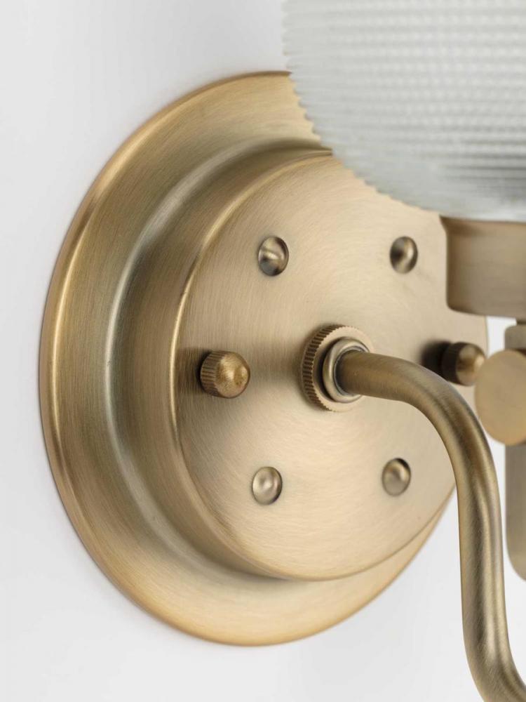 Rejuvenate home décor with the timeless Archie one-light bath. A triplet set of double, prismatic glass shades are held in linear fashion by curved arms outfitted in a Vintage Brass finish. A simple bar, adorned by two vintage-style knobs on both of its ends, affixes the piece to a simple, round backplate. This time-honored fixture makes a lovely addition for eliminating shadows above a bathroom or dressing table mirror, in a hallway, or wherever focused light is desired in farmhouse and transitional interiors.