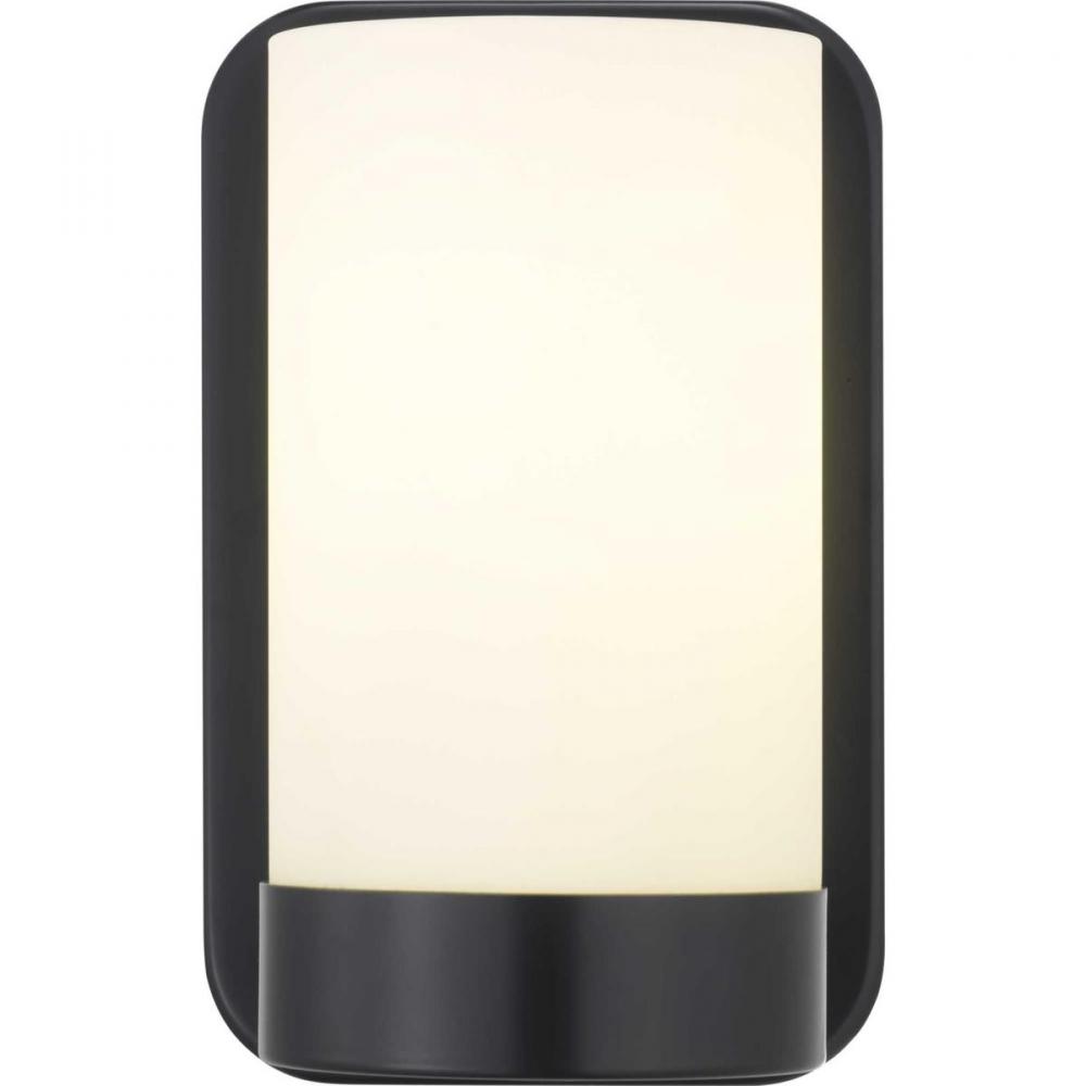 Achieve a Modern look with the Elevate Collections one-light bath and vanity. Etched glass white shades provide a striking contrast to the Matte Black finish. Fixtures can be installed with glass facing up or down for added customization.