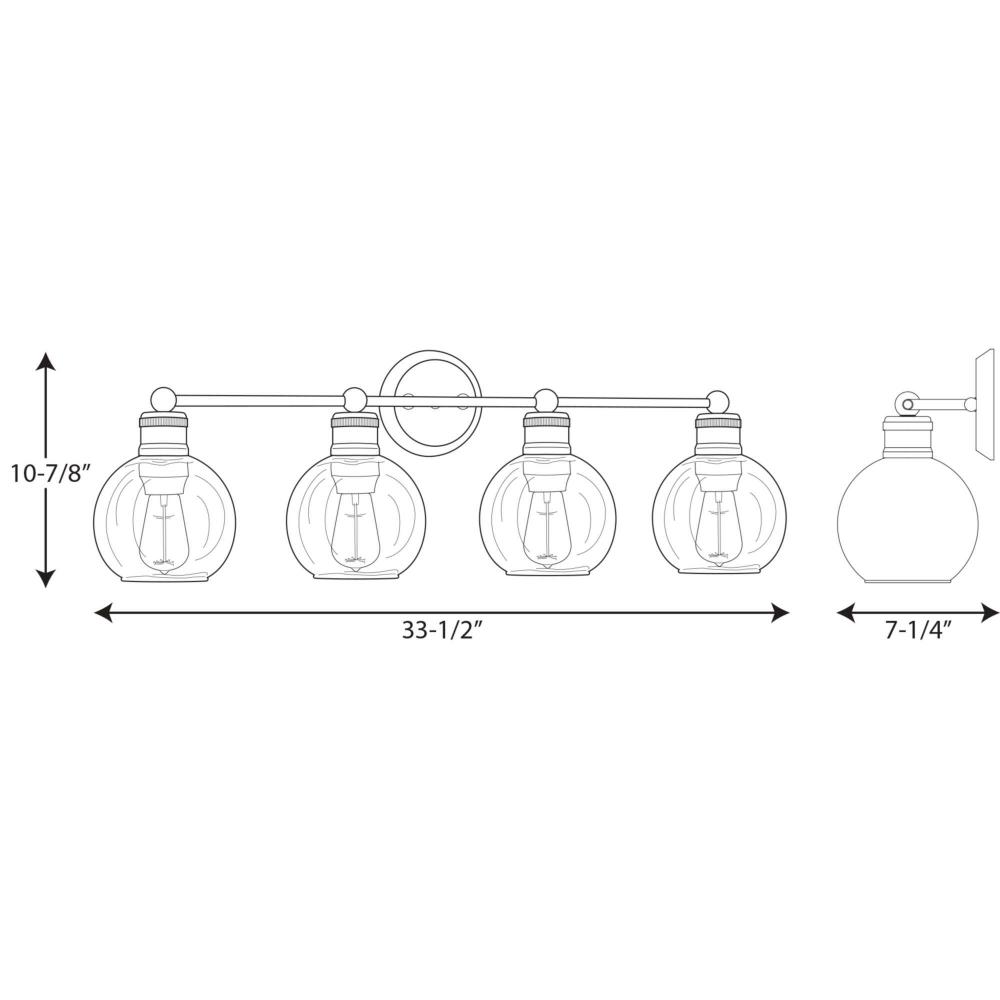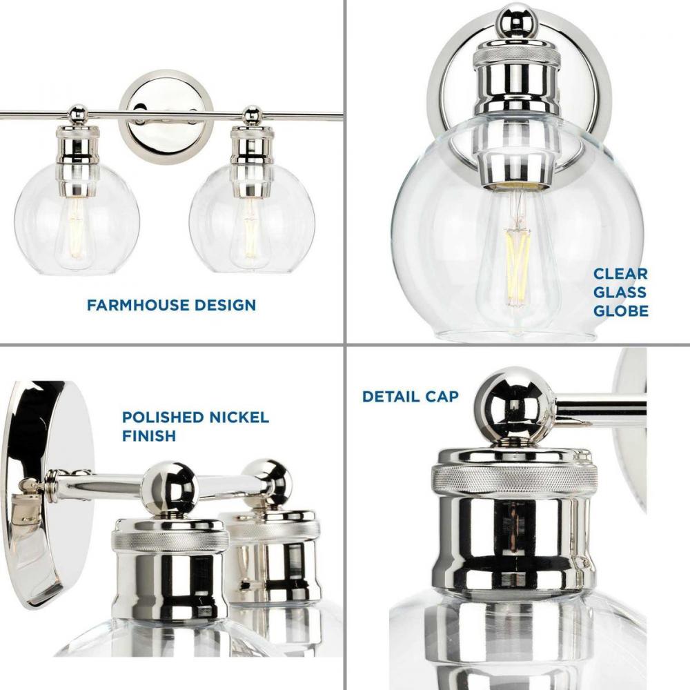 Ideal for a bathroom;Perfect for coastal, farmhouse, and vintage electric style settings;Subtle polished nickel finish;Crisp clear glass shades;Mount the light fixture facing up or down;Use 4 medium base bulbs that are sold separately (100 W max - LED/CFL/