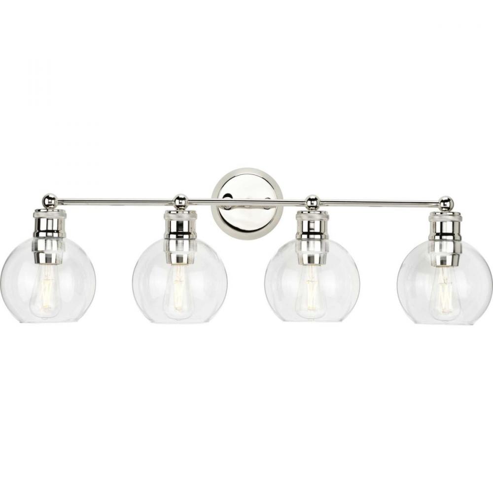 The Hansford collection of fixtures feature a clear, spherical shade paired with vintage style metal fittings in a Polished Nickel finish. Featuring a clean and precise design with generous scale, Hansford's classic style brings tranquility to your home with. Hansford lends itself to Farmhouse, Coastal or Industrial interiors. Can be used with clear or vintage bulbs for a variety of looks. The four-light bath & vanity fixture can be mounted up or down.