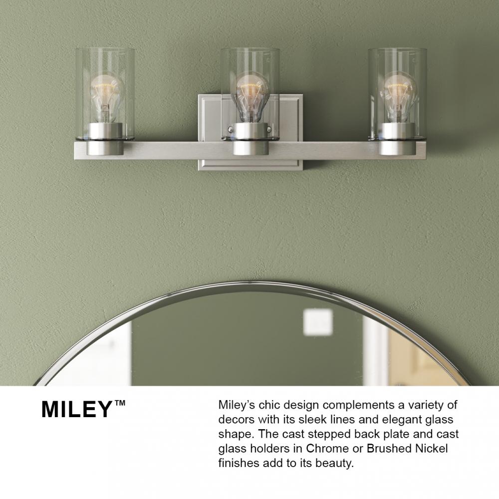 Miley’s chic design complements a variety of décors with its sleek lines and elegant glass shape. The cast stepped back plate and cast glass holders in Chrome or Brushed Nickel finishes add to its beauty.