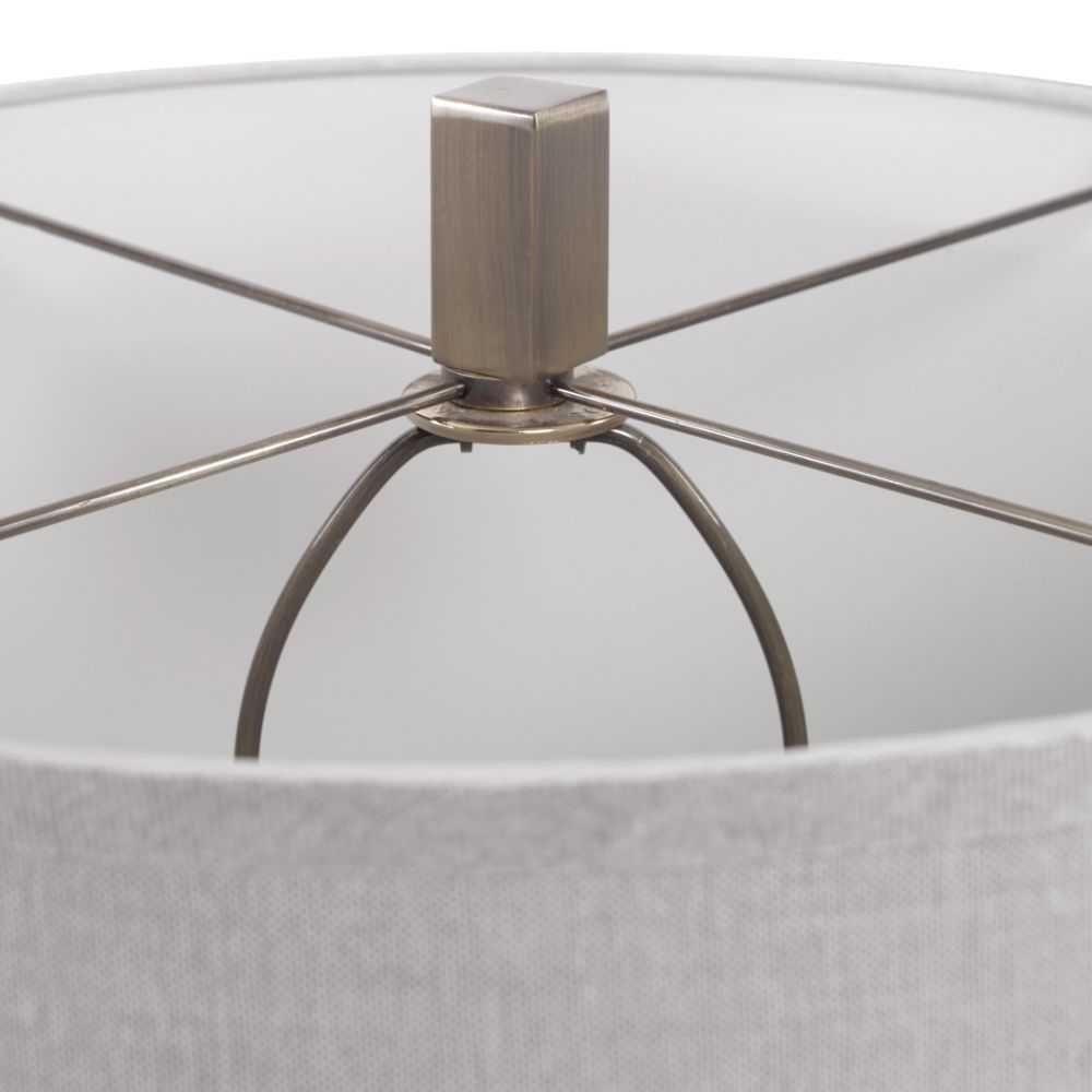 Grooved, Transparent Charcoal Gray Glass Accented with Antiqued Brass Plated Details. The Round Hardback Drum Shade is A Light Beige with Natural Slubbing.