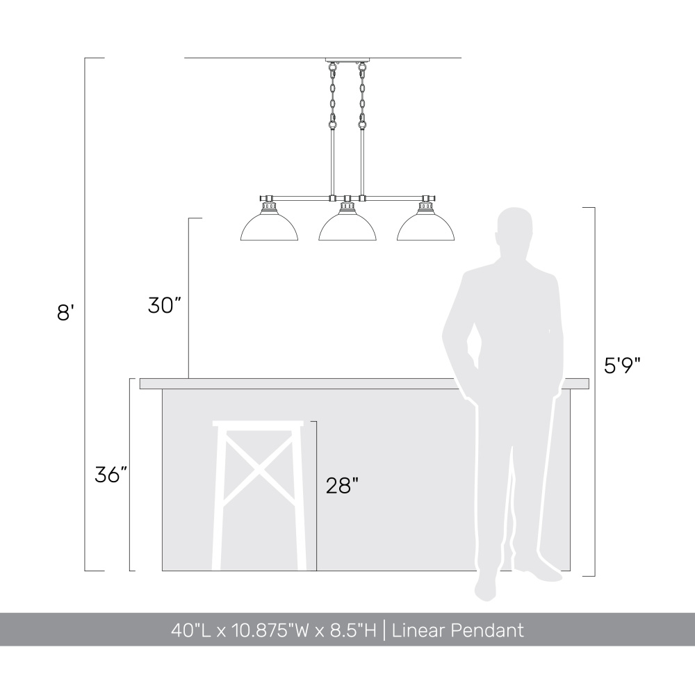 Bring Farmhouse elegance into your home with the Yep by Golden Lighting Duncan 3-light Island Light. Featuring a black metal shade and a matte black frame, it creates an inviting ambiance. This black metal shade boasts a glossy finish, giving off a high-impact look with its reflective sheen that beautifully enhances surrounding light. The Matte Black finish is not only timeless but also endlessly versatile, delivering sophistication that complements a variety of decor styles. Designed for kitchen islands, this fixture is Dry Location Rated, ensuring safety in indoor spaces not subjected to moisture. With its convertible design, the light's height is fully adjustable, suitable for both sloped and flat ceilings. Overall Dimensions: 40"W x 8.5"H x 10.88"D. The fixture requires 3 E26 Medium base bulbs (not included) with a maximum wattage of 100 per bulb. The Duncan light serves as a stylish centerpiece that combines utility and aesthetic appeal, perfect for those seeking quality lighting solutions.